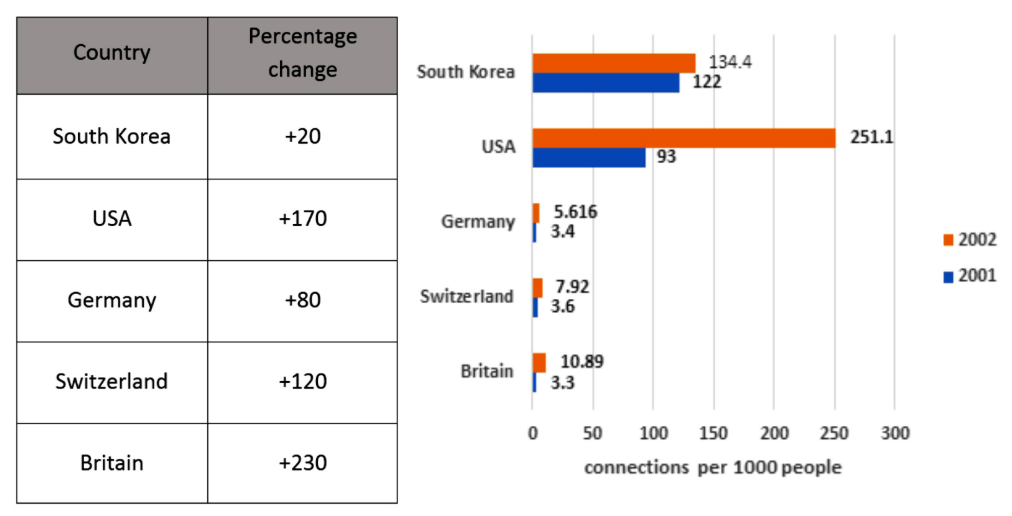 It is clear that the percentage of families with high-speed internet connection was highest in South Korea and the USA during those years. In addition, the biggest change in the number of families with high-speed internet access occurred in Britain.