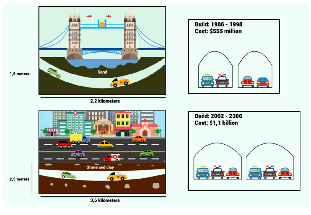 Overall, there are a number of differences between the two tunnel systems, in terms of the cost, size, length, time of construction, and the surrounding environment. The first tunnel cost approximately half as much as the second tunnel to construct, however, the first tunnel was significantly smaller in terms of length and vehicle capacity. The first tunnel also took much longer to construct.