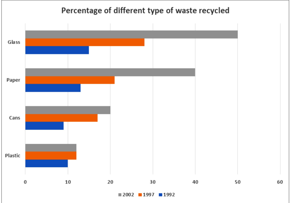 The bar chart compares the recycling rates of four different kinds of waste material in a city, from 1992 to 2002.