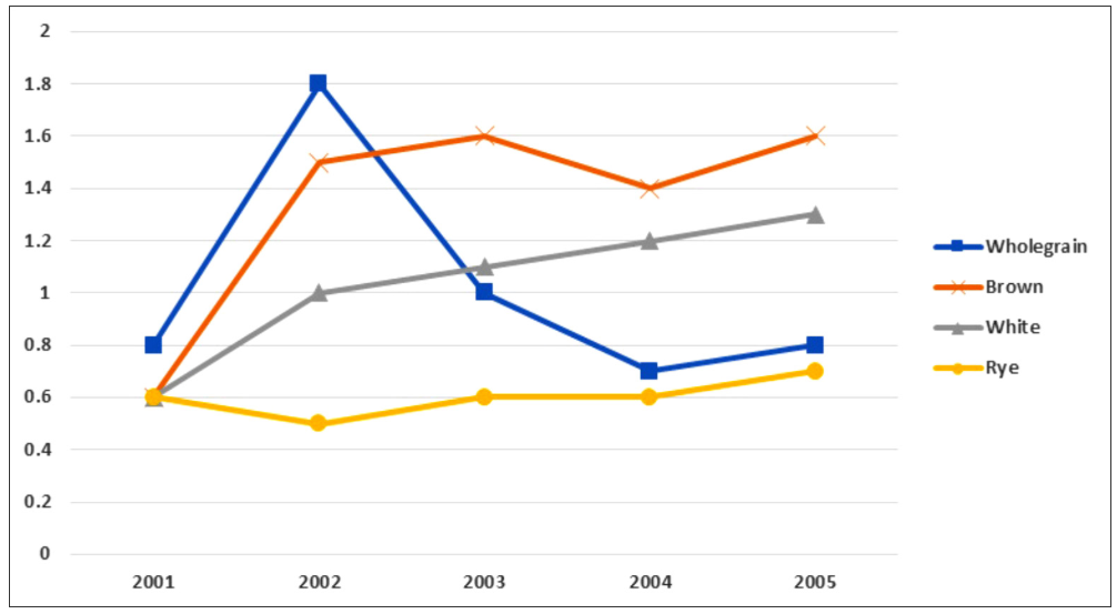 From 2002 to 2005, the figures for rye bread and white bread both increased considerably to 1.3 and 0.7 euros respectively, while there was a substantial drop of 1 euro in the price of wholegrain bread in 2005. Meanwhile, the price of brown bread fluctuated wildly between 1.4 euros and 1.6 euros throughout the period.