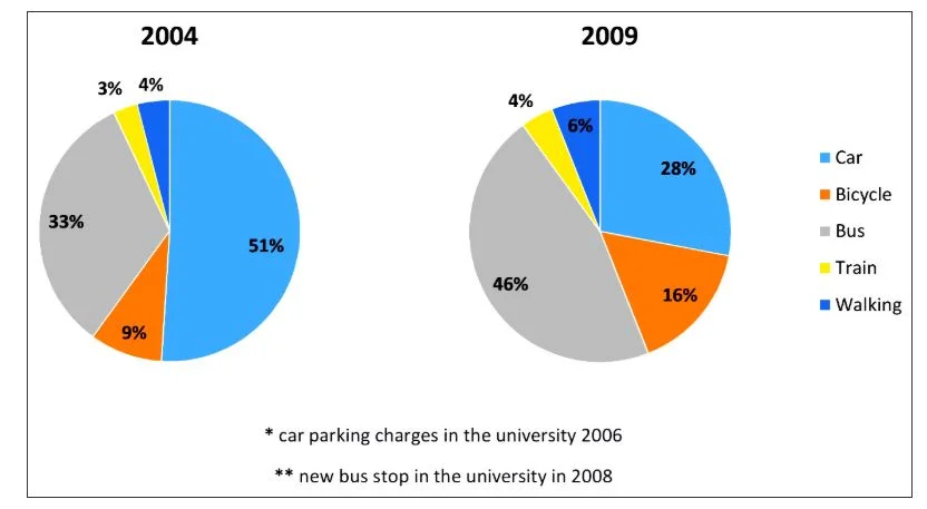 The given pie charts compare the percentage of students using five different means of transportation (Car, Train, Bus, Bicycle, and Walking) to travel to a particular university during 2004 and 2009.