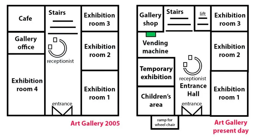Maps showing the changes in the art gallery ground floor (2005 and present day)