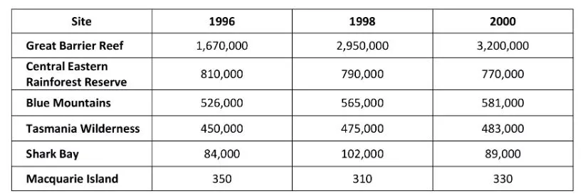 The table illustrates the number of people visiting six World Heritage sites in Australia between 1996 and 2000.