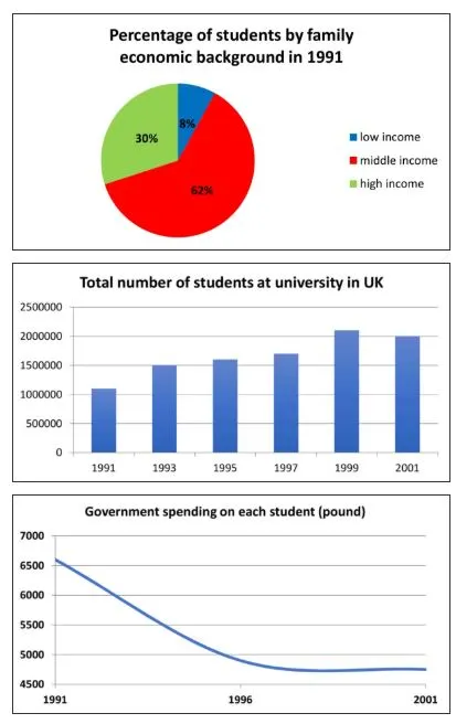 The charts illustrate the number of undergraduates in the UK, government spending on each student from 1991 to 2001, and compare the percentages of students from different family economic backgrounds in 1991.