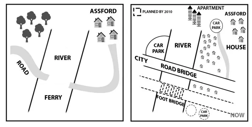The most notable change in the area is the replacement of the ferry with a road bridge. On the northern side of the bridge, the forest on the left riverside was cleared to construct a large car park. A smaller car park was also built on the opposite side of the river, accessible via a small path from the main road. Additionally, numerous houses and apartments were constructed around this car park.