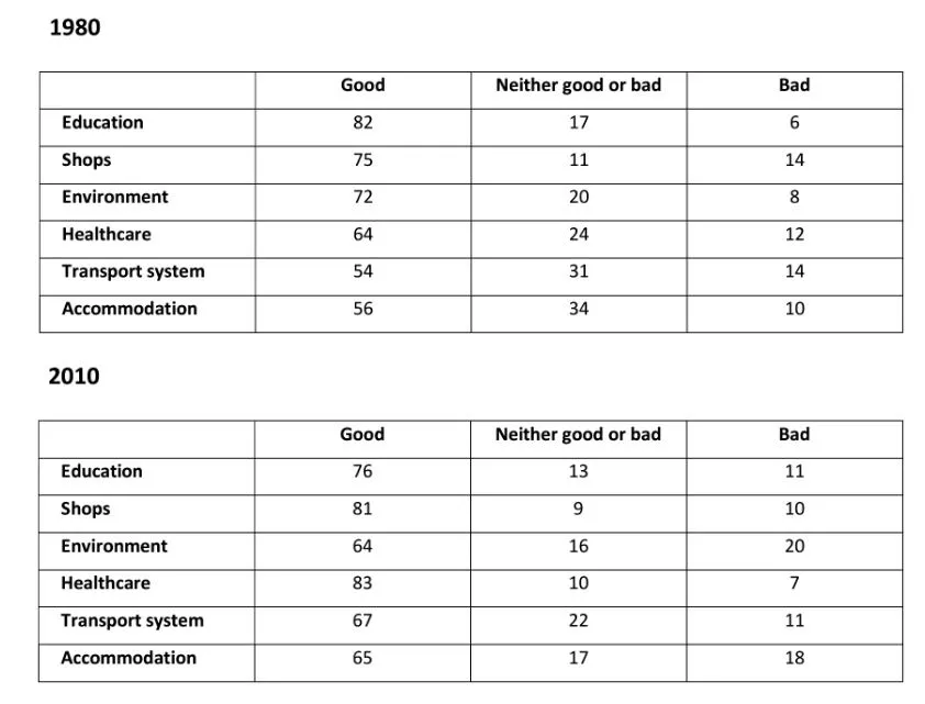 In 1980, 82% of respondents rated education positively, followed by shops (75%) and environment (72%). However, only 54% and 56% were satisfied with transport and accommodation, respectively, which also had the highest neutral opinions at 31% and 34%. Negative feedback was highest for shops and transport (14% each), compared to just 6% for education.