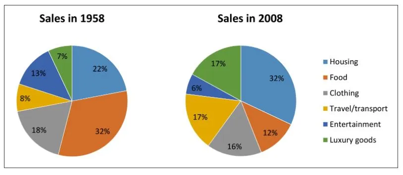 The charts below show the proportion of people’s total spending in a particular European country was spent on different commodities and services in 1958 and in 2008.