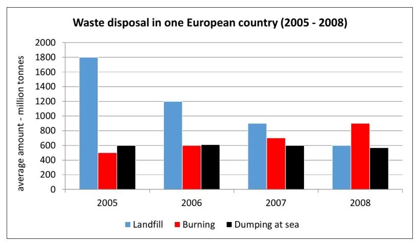 The bar chart illustrates the amount of waste disposed of through landfill, burning, and dumping at sea in a European country from 2005 to 2008.
