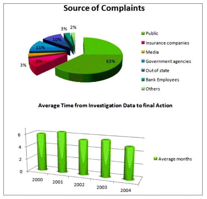 The pie chart shows that the public is the primary source of complaints, accounting for 63%. The remaining 37% is distributed among government agencies, out-of-state agencies, and insurance companies (each contributing 8–11%), with media and bank employees each responsible for 3%. The bar graph indicates that the average time to resolve complaints is approximately 5 months across most years. However, in 2001, the resolution time peaked at 6 months due to complaints about medical misconduct. A noticeable drop to 5 months occurred in 2002, and subsequent years maintained this average, with a slight decreasing trend over time.