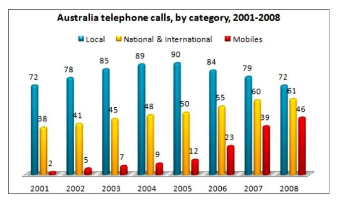 The bar chart illustrates the total minutes (in billions) of telephone calls in Australia from 2001 to 2008, categorized into local fixed line, national and international fixed line, and mobile calls.
