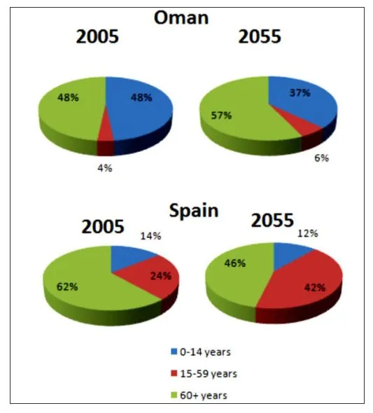 The pie charts compare the age distributions of the populations in Oman and Spain in 2005, with projections for 2055.