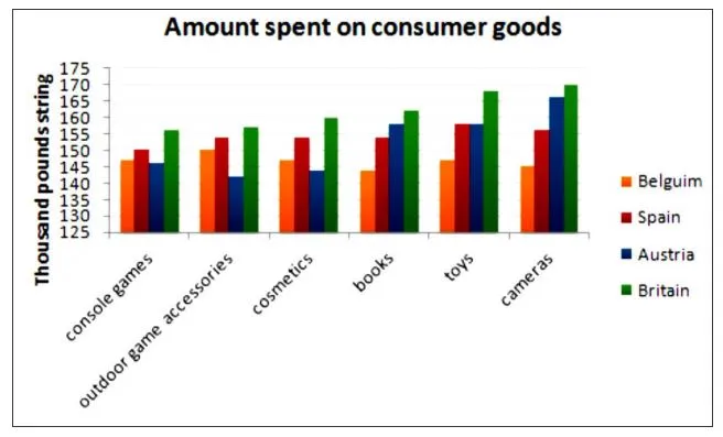 In summary, Britain led in spending across all categories, particularly on cameras, while Belgium spent the least, with toys and cameras being the most popular goods overall.