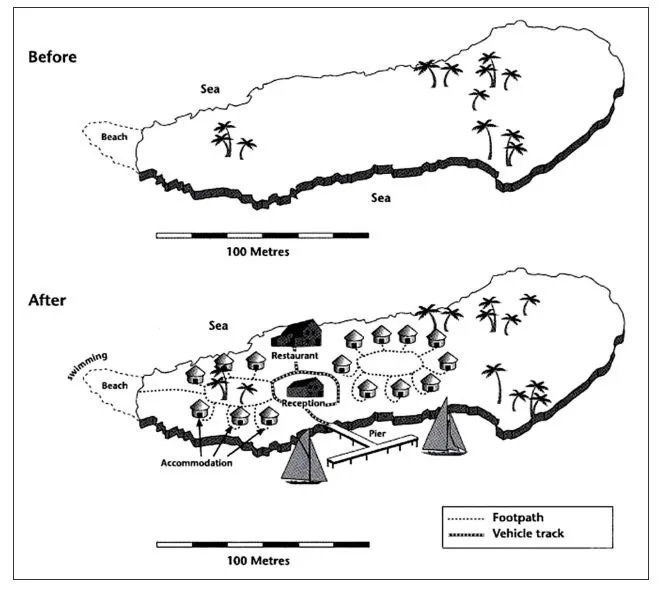 The maps illustrate the transformation of a small island following the development of tourist facilities.